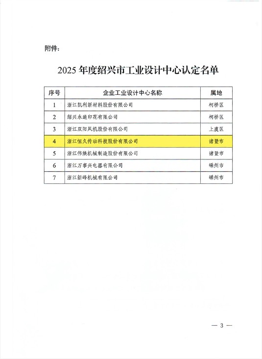Recientemente, Zhejiang Hengjiu Transmission Technology Co., Ltd. aprobó con éxito la certificación del Centro Municipal de Diseño Industrial de Shaoxing 2025 emitida por la Oficina Municipal de Economía y Tecnología de la Información de Shaoxing.